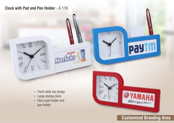 A116 – Clock with pad and pen holder | Branding included MOQ 200 pc