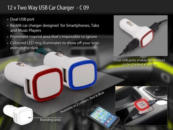 C09 – Backlit Car charger (Dual USB ports) (without cable)
