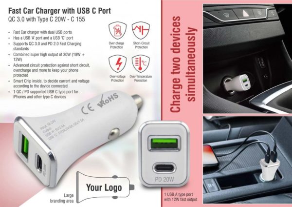 C155 – Fast car charger with USB C port | QC 3.0 withType C 20W