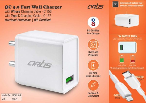 C156 – Artis QC 3.0 Fast wall charger with iPhone charging cable | Overload protection | BIS Certified | MRP 999