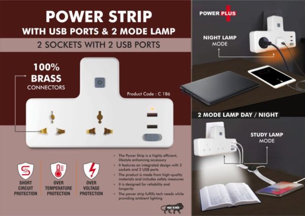 C186 – Power Strip with USB ports & Night Lamp | 2 sockets with 2 USB ports | 2 mode lamp