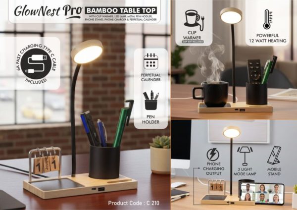 C210 – GlowNest Pro: Bamboo Table top with Cup warmer, LED Lamp, Metal Pen holder, Phone stand & Perpetual calendar