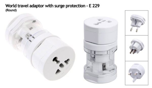 E229 – World travel adaptor with surge protection (round)