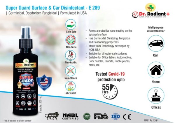 E289 – Super Guard Surface & Car Disinfectant | Germicidal, Deodorizer, Fungicidal | Formulated in USA | Tested Covid-19 protection upto 55 hours | 200 ml | MRP 139 by Dr Radiant Plus