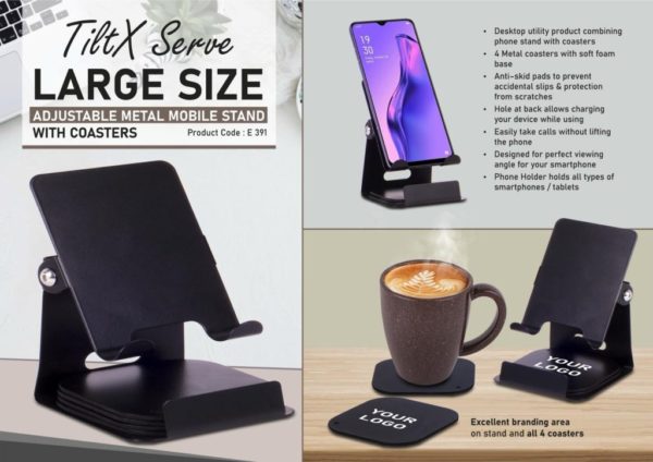 E391 – TiltX Serve: Large size Adjustable metal mobile stand with table coasters | 4 metal coasters