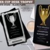 Metal desk trophy with a winners cup on it.