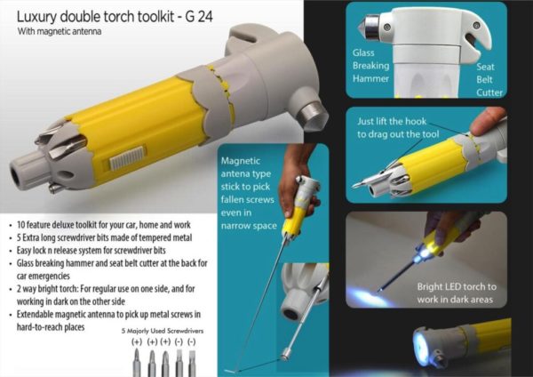 – 5 Extra long screwdriver bits made of tempered metal- Easy lock n release system for screwdriver bits- Glass breaking hammer and seat belt cutter at the back for car emergencies- 2 way bright torch: For regular use on one side, and for working in dark on the other side- Extendable magnetic antenna to pick up metal screws in hard- to- reach places