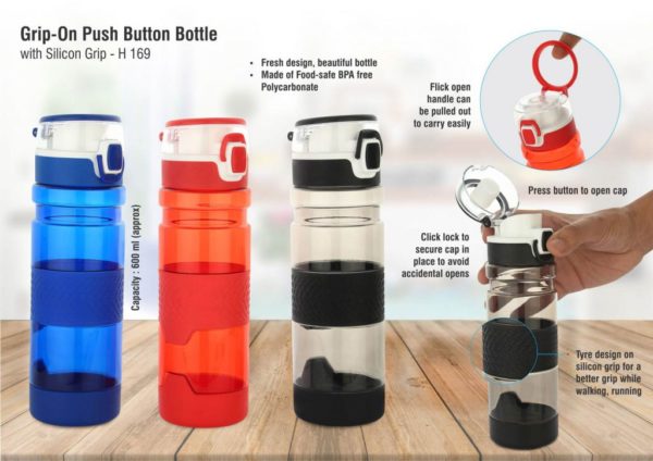 H169 – Grip-On: Push button water bottle with silicon grip (600ml approx) | Made from Tritan | BPA free