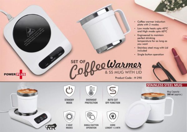 H290 – Set of Coffee warmer & SS Mug with Lid | Auto Cut off & Overheat Protection | 2 heat modes