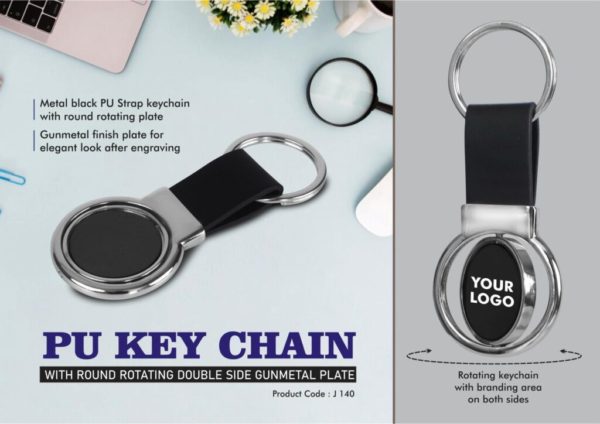 J140 – PU Key chain with Round Rotating Double side Gunmetal plate