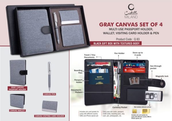 Q83 – Canvas Gray Set of 4: Multi use Passport holder, Wallet, Card holder, Metal Pen