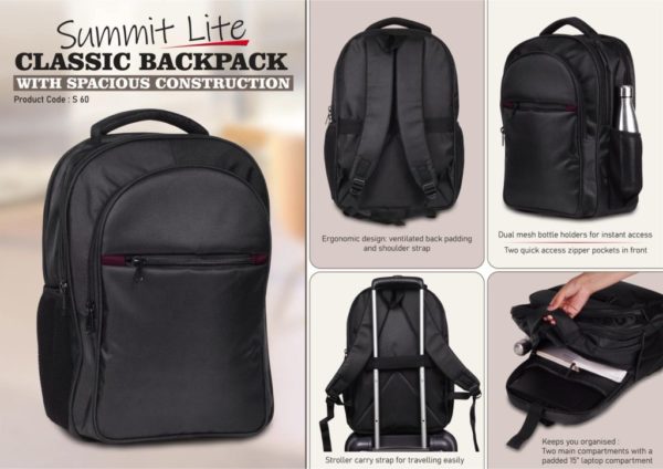 S60 – Summit Lite: Classic backpack with spacious construction & maroon highlights | 4 zipper pockets & 2 side mesh pockets | Stroller carry strap