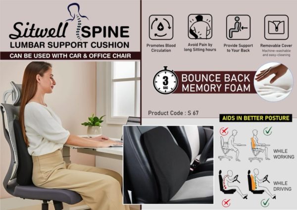 • S67 – SitWell Spine: Car & Office Chair Lumbar Support Cushion with Soft fabric | 3 second bounce back memory foam